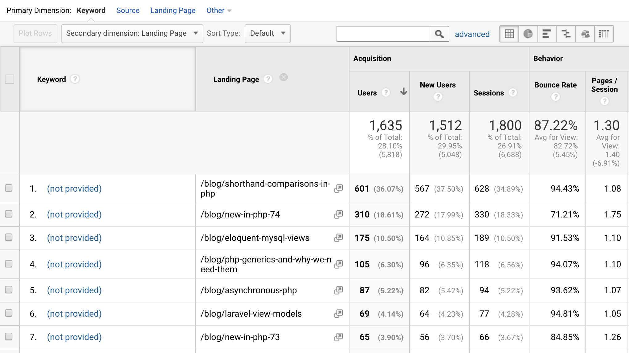 By default, this overview shows what keywords were searched on, which isn't very useful to us right now. You'll also notice that most of the time, this keyword data is simply missing.