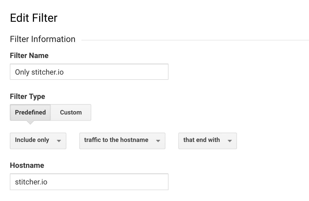 Here's an example of a filter I set up, to only include traffic from the "stitcher.io" domain: