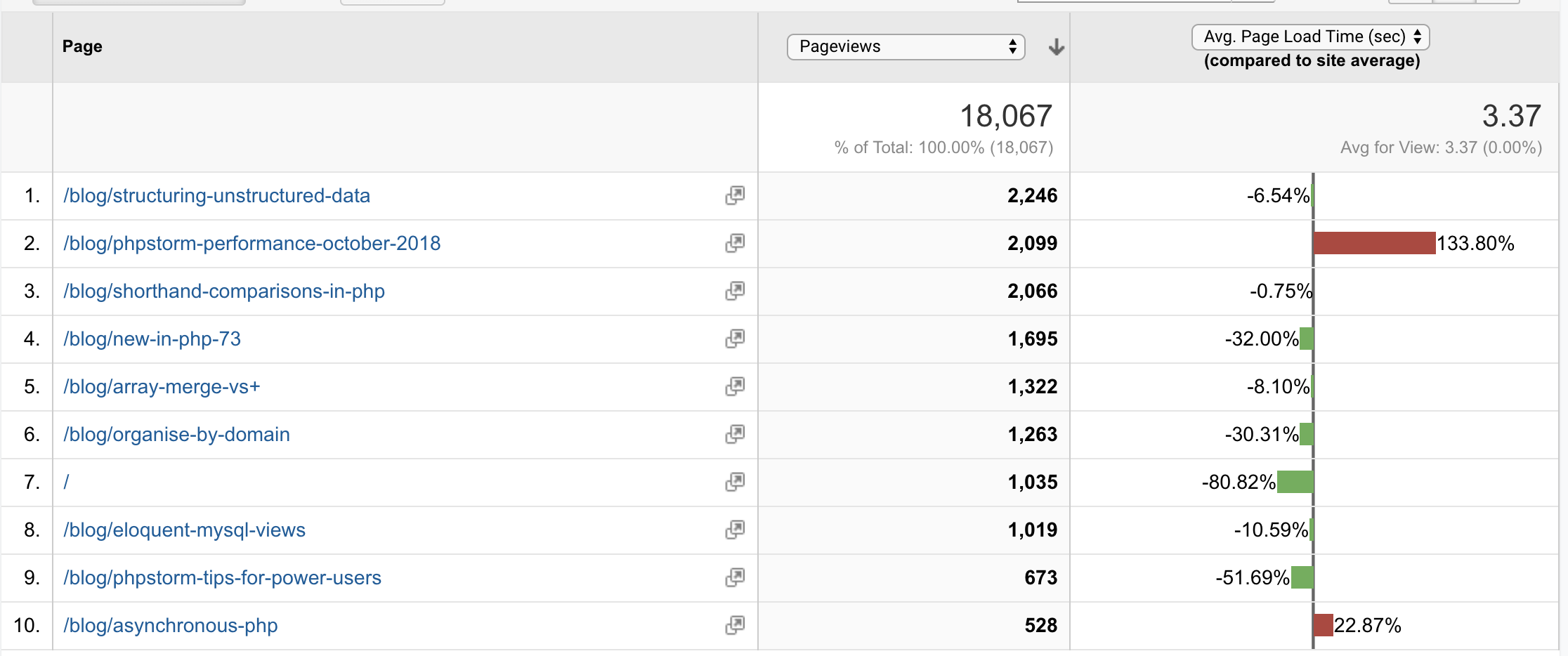 The red lines are the interesting ones: these pages load slower than the site's average. This can be because of many reasons: lots of visitors with a bad connection to the host, images that should be better optimised, maybe a problem with a script I wrote for a post?