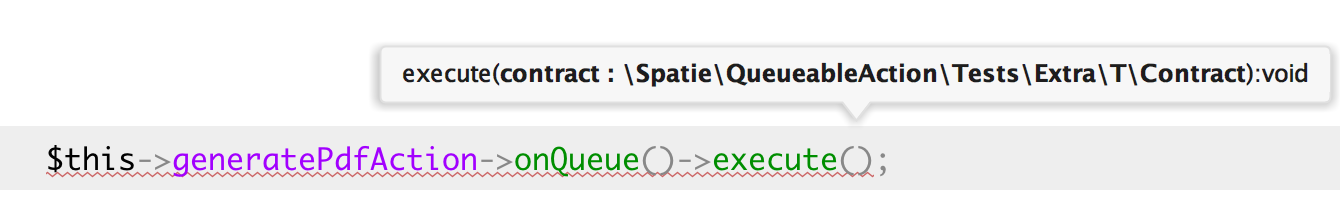 use Spatie\QueueableAction\QueueableAction; class GeneratePdfAction { use QueueableAction; public function __construct( Renderer $renderer, Browsershot $browsershot ) { /* … */ } public function execute(Pdfable $pdfable): void { $html = $this->renderer->render($pdfable); $this->browsershot ->html($html) ->save($pdfable->getPath()); } }