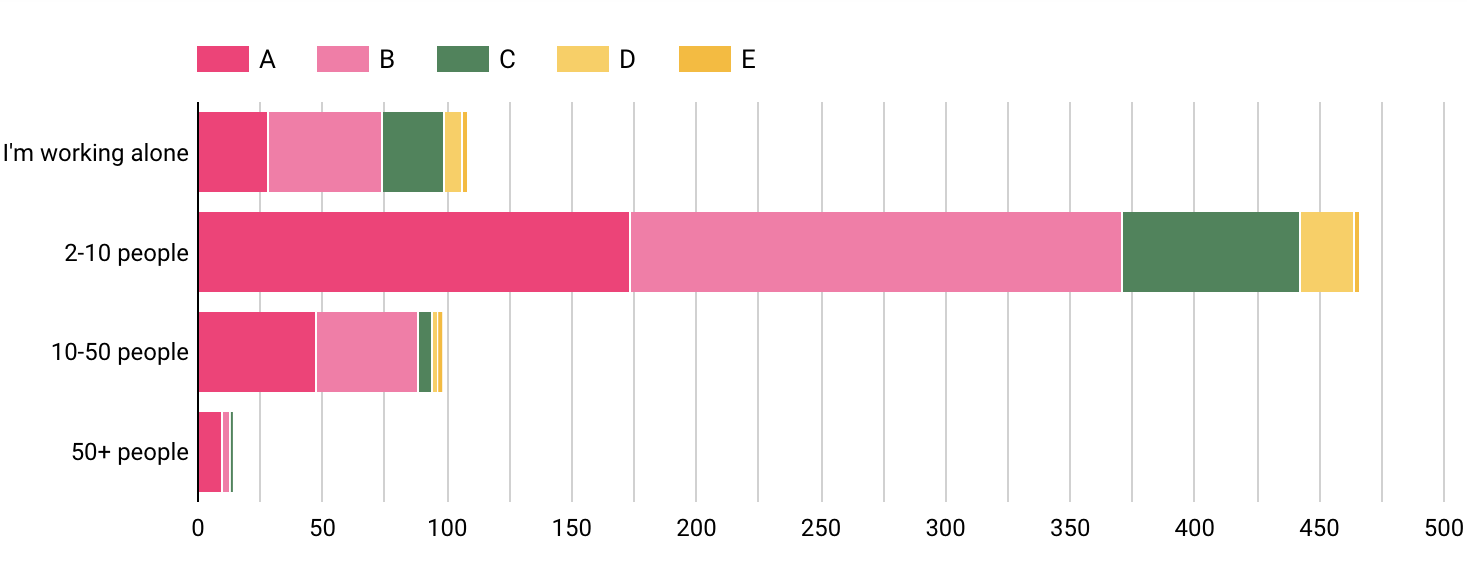 Of course this survey wanted to examine whether there's a correlation between personal preference and team- and project size. Let's look at team size first.