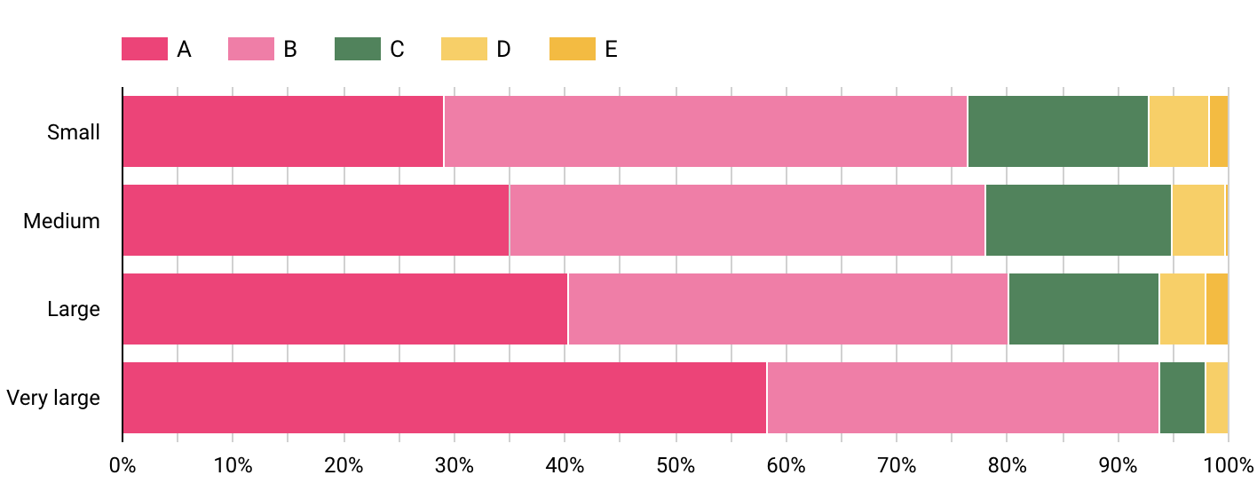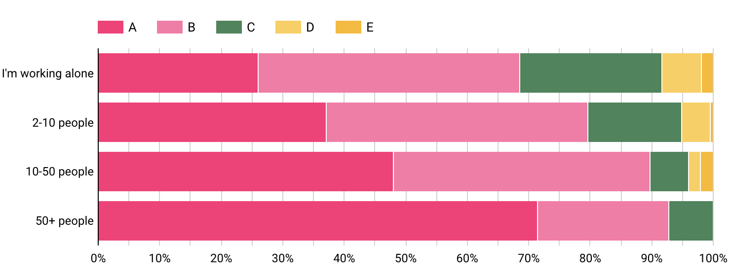 As I expected, based on discussions: profiles D and E are more present in smaller teams. Yet I admit I expected that group to be larger again.