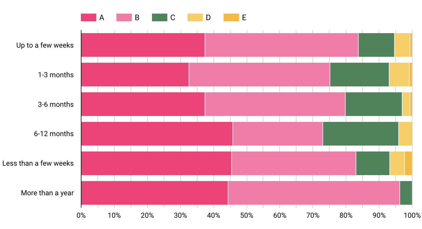 Again we see a preference for stricter type systems in longer projects, but we should of course be aware that there were less participants in these groups. Furthermore, I found it interesting that in this case, there' no linear pattern to discover, as with the previous charts.