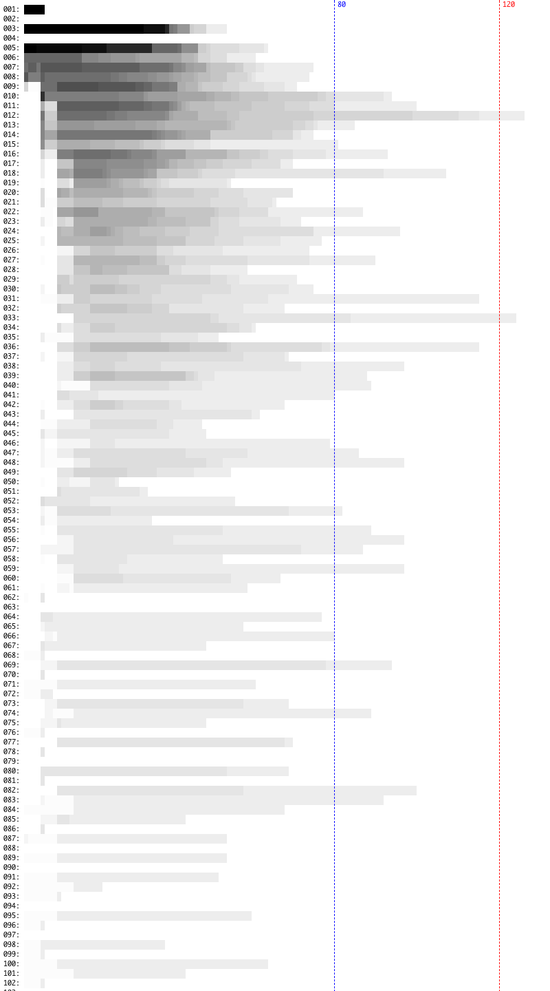 The darker the image, the more code across all files in that position. You can see that while some files are longer, most of the code lives in the upper 50 lines, something we strive for.