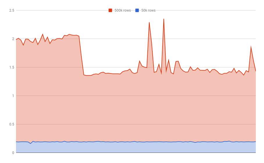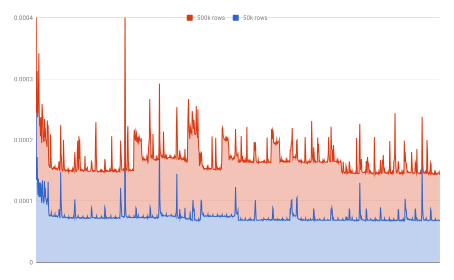 Take a look at the following graph, plotting the execution time of hundred queries against two datasets: one with 50k rows, one with 500k rows.